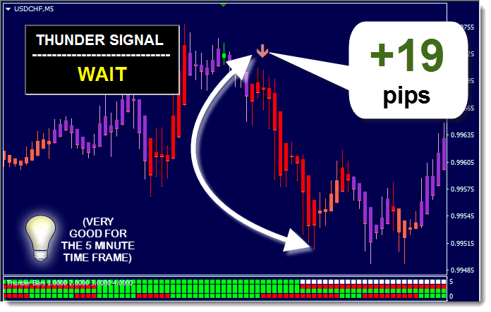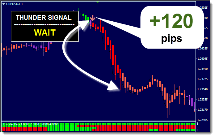 - A red down arrow appears from the ThunderMain indicator, indicating a sell opportunity.