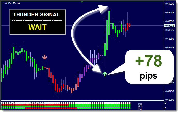 - A green up arrow appears from the ThunderMain indicator, indicating a buy opportunity.