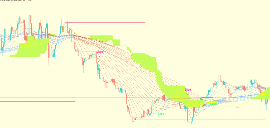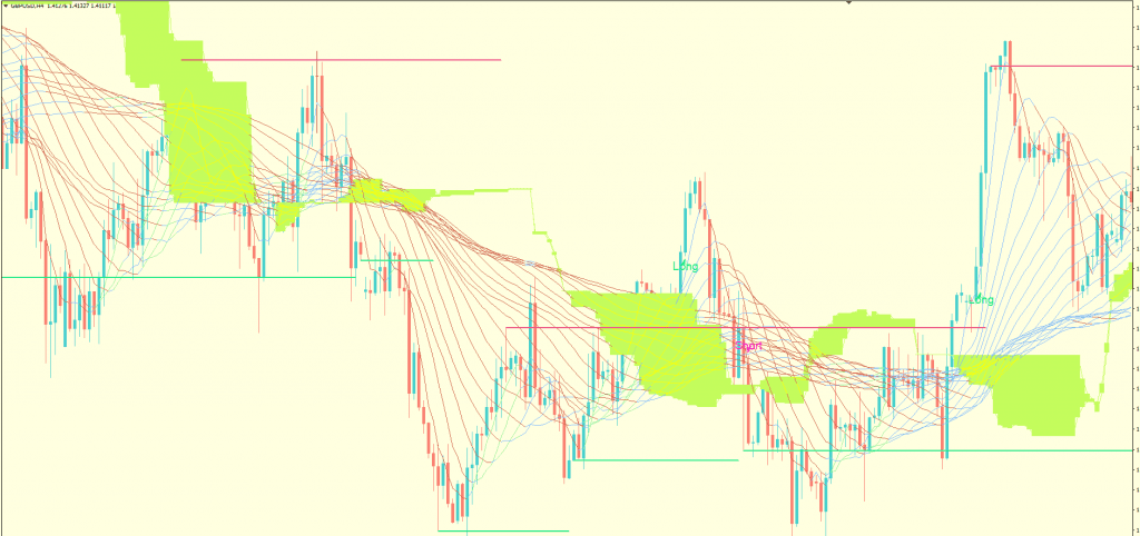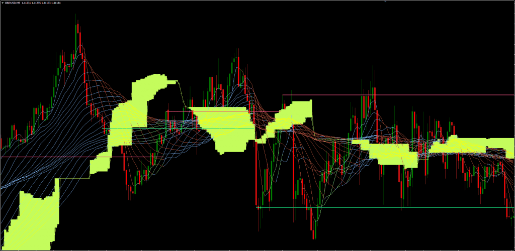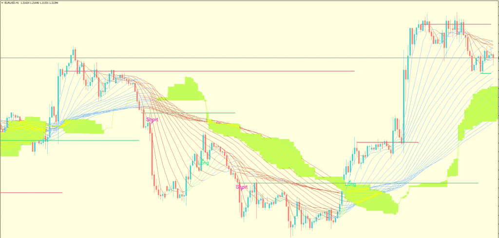 This ribbon and channel both acts also as dynamic resistance and support depending on where the current price is floating. Price floating above the channel and ribbon will act as a support level and when price floating below the channel shall act as resistance and price will feel difficulties to break above the channel and ribbon.