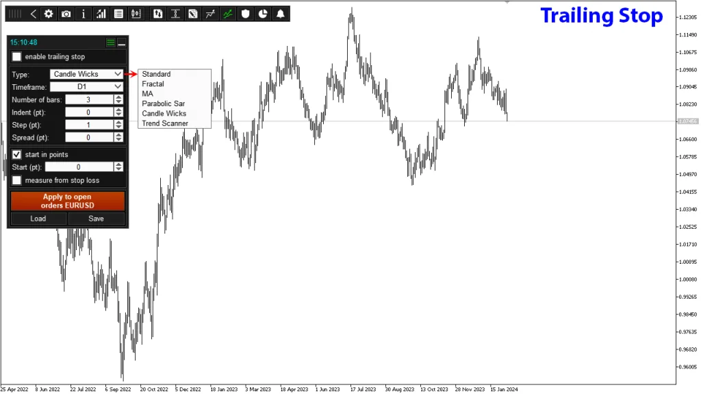 - Six Types of Trailing Stop – You can use six different trailing stop algorithms to move your stop loss in the direction of profit.