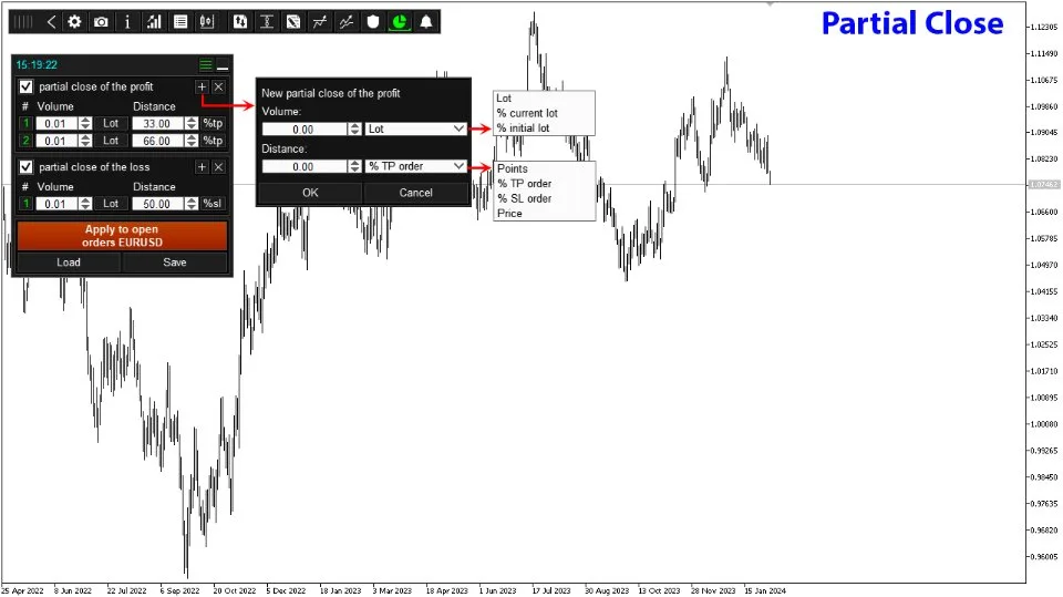 This tool allows you to set partial closing levels, automatically closing portions of a position once a specified profit is reached. The closing volume can be defined as a fixed lot, a percentage of the current lot, or a percentage of the initial lot.