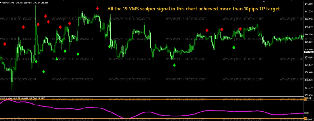 100% non-repaint, with 95% proven 5 to 10 pips directional trend. The YMS scalper gives you a purchase or SELL signal. All you are doing is place your BUY or SELL order when the signal shows up with 5 to 10 pips target. Works on all timeframe but Perfect on H1 timeframes and above.
